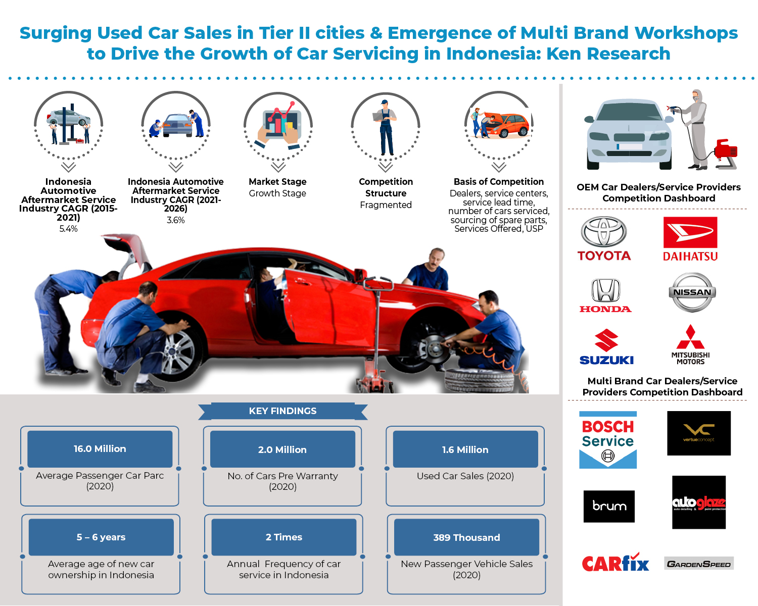 Pendapatan industri jasa aftermarket otomotif Indonesia mencapai USD ~ miliar pada tahun 2021 dan mencatat CAGR sebesar 5,4% selama 2015-2021. Bengkel multi-merek mendominasi industri layanan aftermarket otomotif Indonesia karena biaya layanan yang lebih murah dan penawaran layanan umum. ~% dari pasar layanan perawatan purna jual ditangkap oleh pusat layanan multi-merek karena biaya layanan & suku cadang yang rendah dan preferensi tinggi oleh pemilik mobil pasca garansi. Pusat layanan mobil OEM di Indonesia menyaksikan sebagian besar mobil pra-garansi mengunjungi pusat mereka. Layanan berkualitas tinggi, suku cadang asli, dan keandalan lebih pada pusat layanan OEM adalah alasan lain mengapa pelanggan lebih memilih pusat layanan OEM di Indonesia.